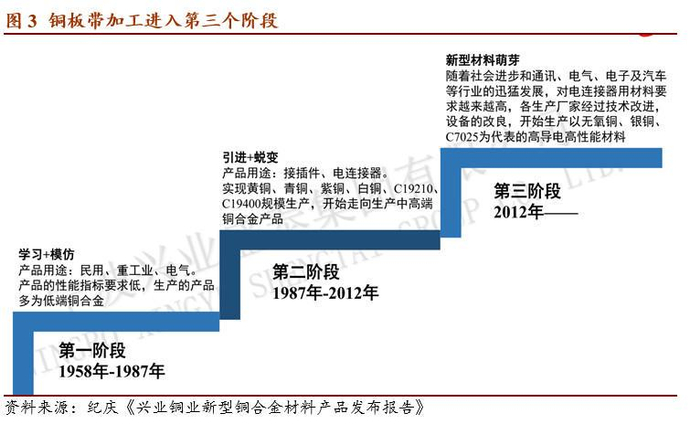 我国铜加工行业经历了三个阶段,目前进入了以 C7025 为代表的高性能材料阶段。以满 足通讯、电子和汽车等行业的需求升级