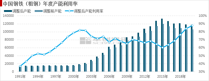 2019年规模以上钢铁企业粗钢产能为10.6036亿吨;
