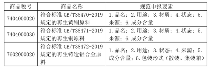 公告规定,从2020年11月1日起,符合《再生黄铜原料》(GB/T38470-2019)、《再生铜原料》(GB/T38471-2019)、《再生铸造铝合金原料》(GB/T38472-2019)标准的再生黄铜原料、再生铜原料和再生铸造铝合金原料,不属于固体废物,可按普通货物进口。