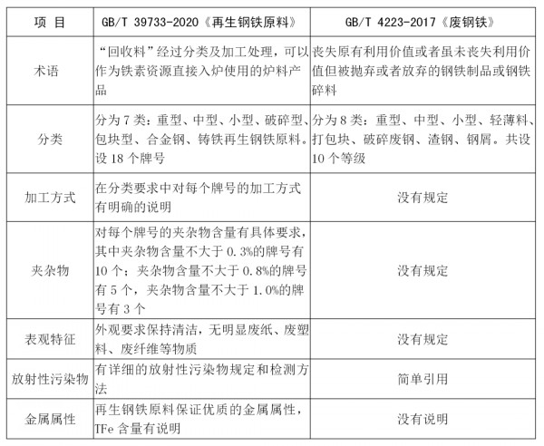 GB/T 39733-2020《再生钢铁原料》与GB/T 4223-2017《废钢铁》国家标准的主要区别见表1。