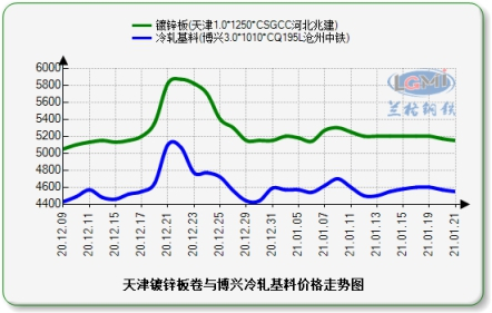 天津镀锌板卷与博兴冷轧基料价格走势图: