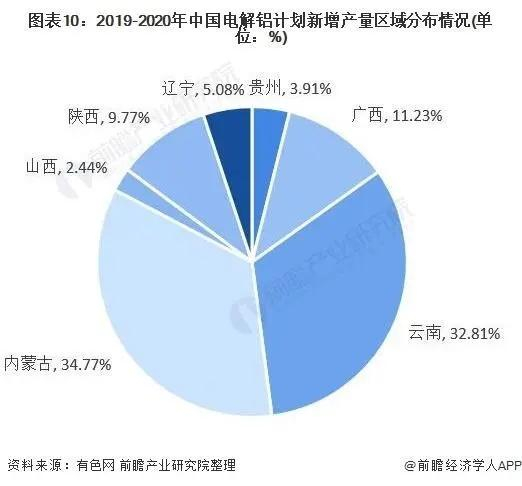 根据有色网数据显示,在2019-2020年我国电解铝计划新增产量中,内蒙古新增产量占比最大,为34.77%;其次是云南省和广西省,占比分别为32.81%和11.23%。总体来看,电解铝产地分布较为分散。从每年的新增产能上看,电解铝有向云南、内蒙转移的趋势,核心是电力优势。