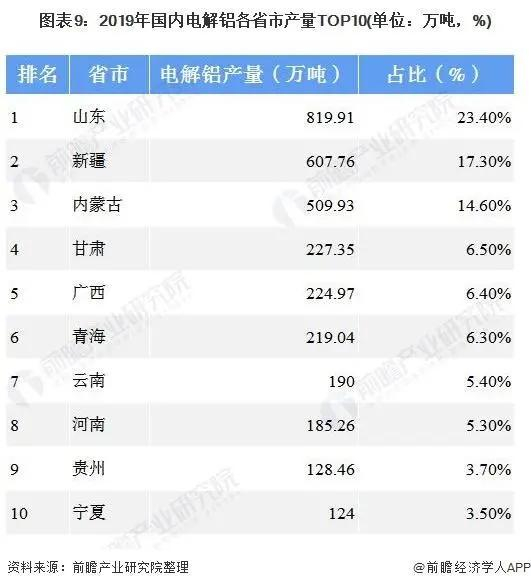 山东、新疆电解铝产量位于全国前两位