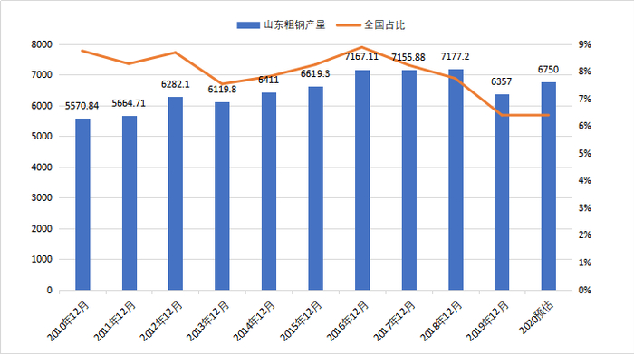 从山东粗钢产量数据看,2019年山东省粗钢产量下滑了820万吨,全国产量占比降低至6.39%,这也是10年来最低占比水平;2020年山东省粗钢产量预估值为6750万吨,占全国比重约为6.41%。究其原因,主要是山东钢铁产业装备相对落后,在秋冬季重污染天气等不利因素影响下,山东西部济南、德州、淄博、滨州等区域钢企减产检修增多所致。