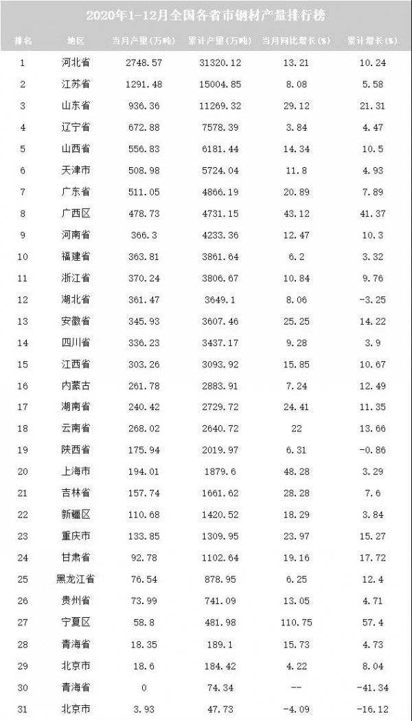 2020年全国各省市钢材产量排行榜