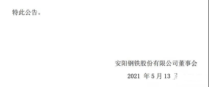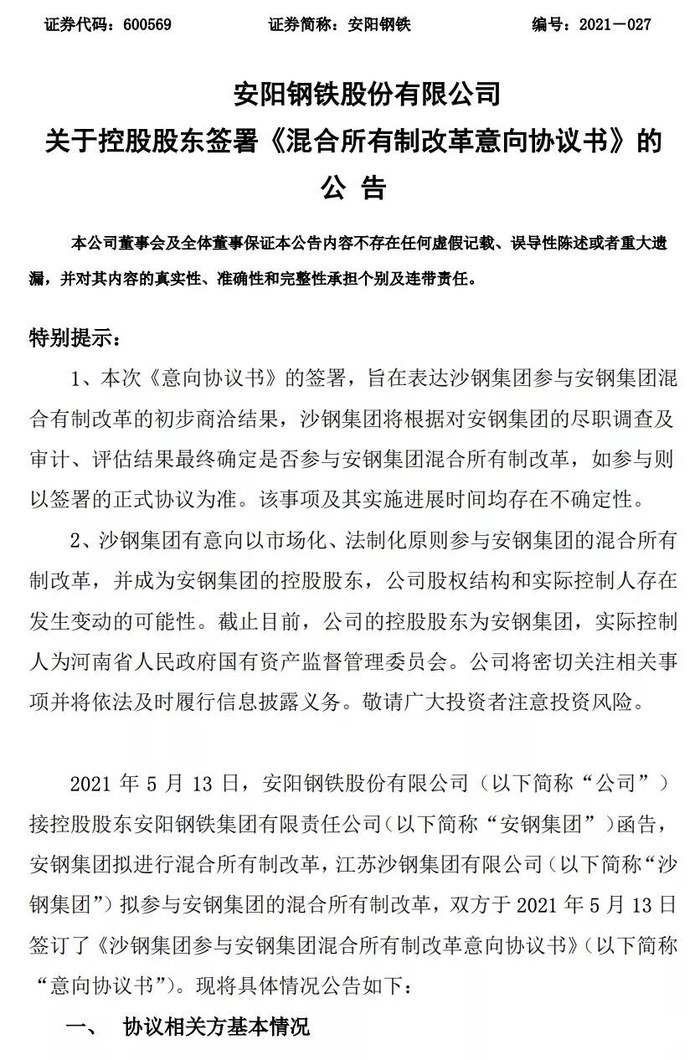 2021年5月13日,安阳钢铁股份有限公司(以下简称“公司”)接控股股东安阳钢铁集团有限责任公司(以下简称“安钢集团”)函告,安钢集团拟进行混合所有制改革,江苏沙钢集团有限公司(以下简称“沙钢集团”)拟参与安钢集团的混合所有制改革,双方于2021年5月13日签订了《沙钢集团参与安钢集团混合所有制改革意向协议书》(以下简称“意向协议书”)。