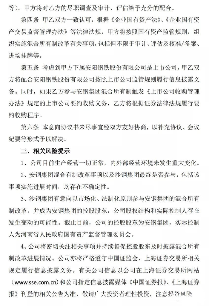 2、安钢集团混合有制改革事项以及沙钢集团最终是否参与,包括该事项实施进展时间,均存在不确定性。