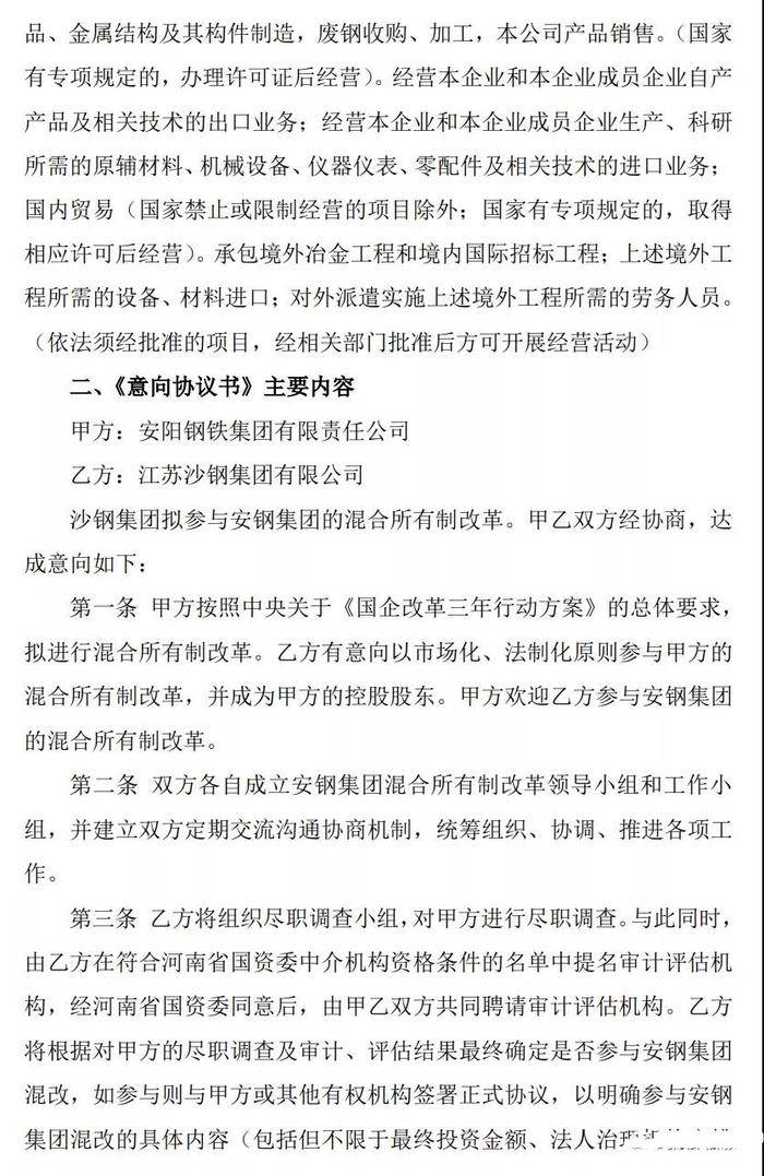 沙钢集团有意向以市场化、法制化原则参与安钢集团的混合所有制改革,并成为安钢集团的控股股东。双方将各自成立安钢集团混合所有制改革领导小组和工作小组,并建立双方定期交流沟通协商机制,统筹组织、协调、推进各项工作。根据协议,沙钢集团将组织尽职调查小组,对安钢集团进行尽职调查。与此同时,双方按程序共同聘请审计评估机构。沙钢集团将根据对尽职调查及审计、评估结果最终确定是否参与安钢集团混改。