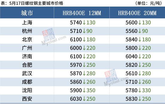建筑钢材:5月17日,全国31个主要城市20mm三级抗震螺纹钢均价5826元/吨,较上个交易日下跌274元/吨。早盘期螺继续低开低走,上午国内多数地区建筑钢材价格明显回落。从市场成交来看,由于盘中整体成交表现不佳,资源继续低靠,投机性需求减少,终端按需采购,成交热情有所减弱,商家心态低迷。预计18日国内建筑钢材价格或跌势收窄。