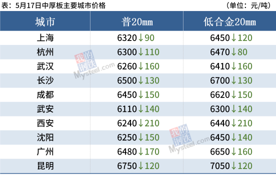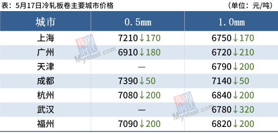 冷轧板卷:5月17日,全国24个主要城市1.0mm冷卷均价6954元/吨,较上个交易日下跌170元/吨。受黑色期货震荡走弱,以及普遍冲高回落情绪影响下,整体钢价持续回调。据商户反馈,今日价格持续大幅回落,成交一般,且部分部分贸易商逢低补货,而局部市场商户多暗降出货为主,提前降库兑现;下游方面看,下游多按需采购为主。预计18日国内冷轧现货价格跌幅或呈收窄。