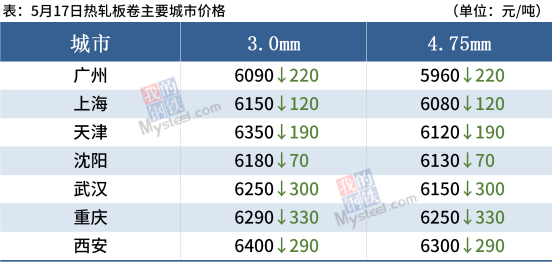热轧板卷:5月17日,全国24个主要城市4.75mm热轧板卷均价6258元/吨,较上个交易日下跌211元/吨。现货市场早盘报价小幅下跌,跌后市场成交乏力,午后价格继续下跌,跌后依然难以成交,市场投机需求也开始出现观望,情绪明显走弱,近期大宗商品整体行情回调,相较前期的热情明显有所降温,但基本面仍没有明显改变,短期回调后预计将维持弱稳运行。