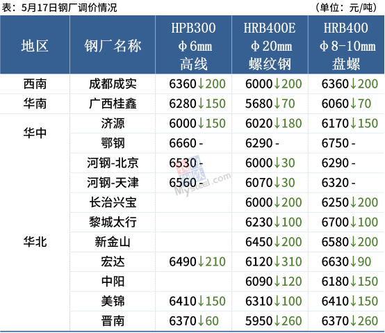 17日,全国11家钢厂下调建筑钢材出厂价30-310元/吨。