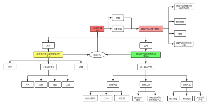 可以看到,整个碳排放权交易体系可以分为三个部分:1.生态环境部及省级生态环境主管部门;2.全国碳排放权注册登记系统(部门);2.全国碳排放权交易系统(部门)。