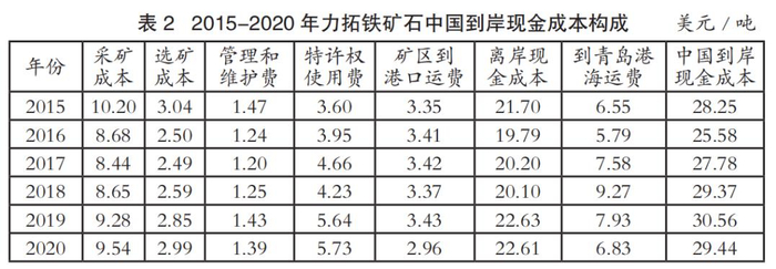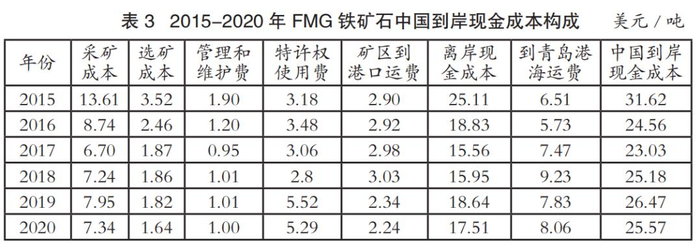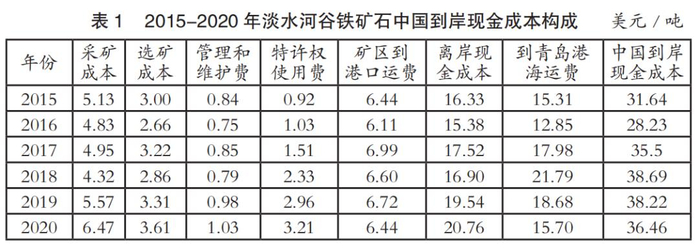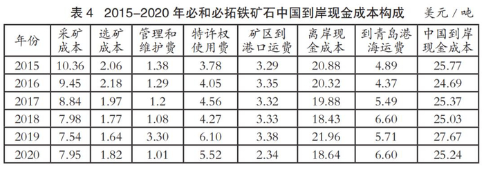 中国进口铁矿石到岸成本主要由离岸现金成本和海运成本两部分构成。表1至表4为2015-2020年国际四大矿铁矿石中国到岸现金成本构成情况(数据来源:AME),其中离岸现金成本由采矿成本、选矿成本、管理和维护费、特许权使用费和矿区到港口运费构成;中国到岸现金成本由离岸现金成本和到青岛港海运费构成;该成本数据仅为现金成本,不含国际四大矿的融资、折旧费用。