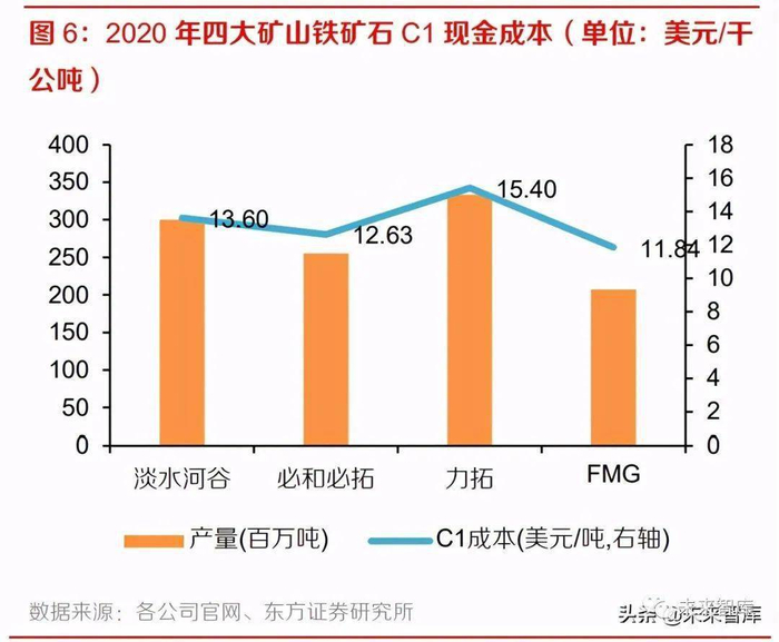 从主流矿山 62%CFR 现金成本来看,四大矿山为 21.06-30.78 美元/干公吨。我们将四大矿山公 布的 C1 现金成本换算为 62%品位时的 CFR 现金成本,计算公式为 62%CFR 现金成本(美元/干 公吨)=(C1*(1+资源税率)+运价)*(1-含水量)*(62%/平均品位)。根据公司公告和 Wind 统计数据,我们计算得到淡水河谷、必和必拓、力拓、FMG 2020 财年 62%CFR 现金成本分别 为 30.78、21.34、22.11、21.06 美元/干公吨。