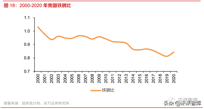 我们预计,2021 年国内长流程生铁产量或将同比下滑 2.3%-6.2%。参考冶金规划院推测生铁产量 时的做法,我们计算了国内铁钢比(生铁产量/粗钢产量),2000-2020 年随着国内废钢使用的增 加,铁钢比整体呈下降趋势。根据冶金规划院 2020 年 12 月 21 日发布的《2021 年我国钢铁需求 预测成果》,考虑废钢使用量增加等因素,预计 2021 年铁钢比为 0.82。因此,我们在下表中给出 了 2021 年粗钢产量的敏感性分析,若 2021 年国内粗钢产量较 2020 年分别下滑 0%、1%、2%、 3%、4%,2021 年长流程生铁产量将分别下滑 2.3%、3.3%、4.3%、5.2%、6.2%。