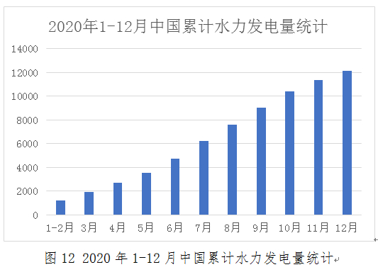 水电方面,据国家统计局数据显示,2019年全年中国水力发电量达到了11534.4亿千瓦时,累计增长4.8%。截止至2020年12月中国水力发电量为764.1亿千瓦时,同比增长11.3%。累计方面,2020年全年中国累计水力发电量达到了12140.3亿千瓦时,累计增长5.3%。