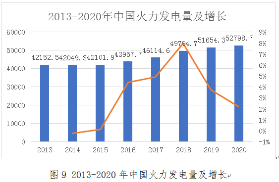 如图9所示,在经济复苏的强劲推动下,对于电力的需求也不断上升,使得火电的发电量仍然在不断上涨。据国家统计局公开数据显示,2020年,以燃煤发电为主的火力发电量高达5.28万亿千瓦时,同比上升2.2%,占全国发电量比例为72.35%。