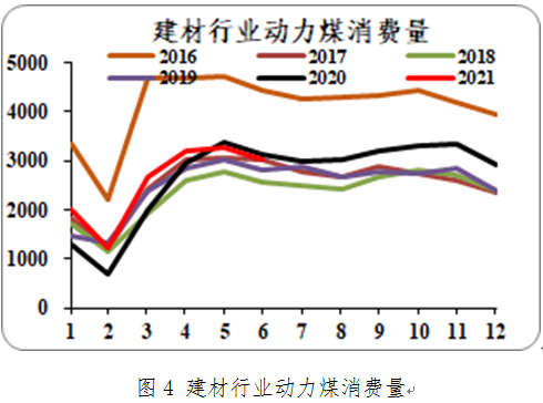 建材行业煤炭消费主要是用来提供燃料,用来生产水泥、玻璃、石灰。随着建筑行业,特别是住宅建筑和基础设施对水泥用量的增加,水泥用煤快速增长。如图4所示,2020年,我国建材业耗煤量32234万吨,仅次于火电耗煤量,位居第二位,占动力煤总消耗量的9%。
