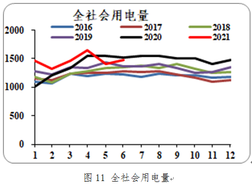如图11所示,2021年1-6月份,全社会用电量约3.9万亿千瓦时,同比2020年增长17.3%,增量近5792亿千瓦时,可以看出经济复苏的拉动效应与补偿效应仍在延续。