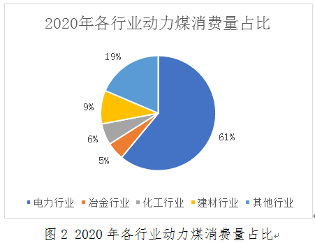 中国动力煤下游需求行业为电力行业、建材行业、冶金行业、化工行业及其他行业。据统计,2020年电力行业动力煤消耗量为208550万吨,建材行业动力煤消耗量为32234万吨,冶金行业动力煤消耗量为17180万吨,化工行业动力煤消耗量为19926万吨,其他行业动力煤消耗量为36864万吨。各行业2020年动力煤消耗量占比如图2所示。