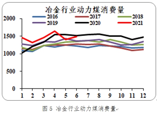 如图5所示,2020年,我国冶金行业消费动力煤17180万吨,较2019年有较大幅度的增长,占动力煤消费总量的5%。
