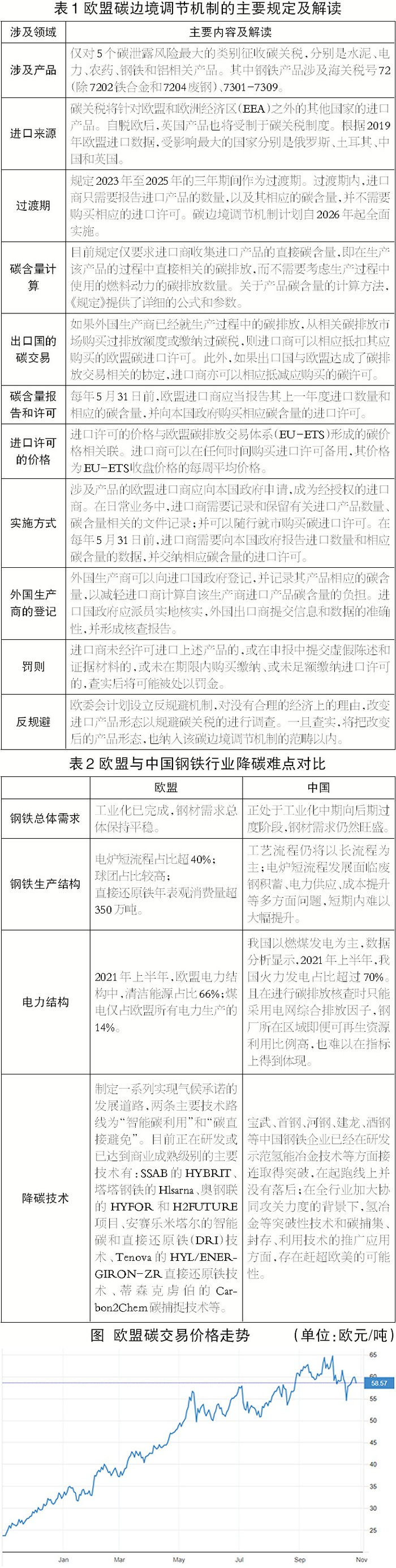 CBAM提出,如果外国生产商已经就生产过程中的碳排放,从相关碳排放市场购买过排放额度或缴纳过碳税,则进口商可以相应抵扣其应购买的欧盟碳进口许可。目前CBAM对于定价机制仍不明确,如果仅考虑从碳市场体现的“显性碳价”,那么钢铁企业节能降碳技术改造、工艺创新、研发攻关等无法通过碳市场体现的投入,即“隐性碳价”则难以被量化。企业在直接出口时,有可能仍需支付国内碳价与欧盟碳价之间的差额。从目前的情况看,截止到12月15日,中国碳市场共运行102个交易日,累计成交1.07亿吨,成交额达44.26亿元,均价仅为41.4元/吨;但欧盟的碳价在全球能源紧张的背景下从年初的25欧元/吨一路攀升至12月8日的89.37欧元/吨的历史最高值,约为我国目前碳交易价格的15倍(如图)。