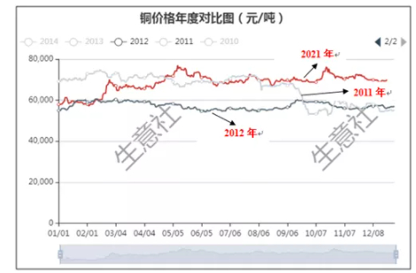 据生意社数据监测,2021年铜价先上涨后盘整,走出“厂”走势,年初铜价57955元/吨,年末上涨为69425元/吨,涨幅为19.79%,现铜的价格和2011年价格相当。