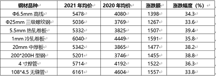 就品种价格来看,2021年,兰格钢铁云商平台监测的8大钢材品种均价与上年同期相比均有明显上涨,其中热轧卷板涨幅最大,为39.4%;三级螺纹钢涨幅最小,为33.6%;其他品种涨幅在34.3-38.8%之间(详见表1)。