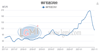 2021年,受到全球大宗商品上涨带动,国际钢铁产能恢复带动原料需求增长,铁矿石市场阶段性供需偏紧,铁矿石价格冲高并创下十年新高;后期随着中国减产力度加大,铁矿石需求收缩,矿价高位回落,但全年均价呈现上移特征(详见图7)。兰格钢铁云商平台监测数据显示,2021年,普氏铁矿石价格指数均值160.1美元,同比上涨47.4%;海关进口铁矿石均价169.9美元,同比上涨64.5%。
