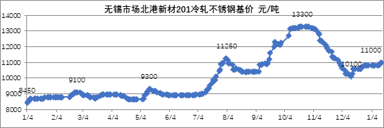2021年201不锈钢冷轧产品(北港新材)从年初8450元/吨,一路震荡上涨,年内价格顶点出现在10月,涨至13300元/吨,环比年初价格上涨4850元/吨;随后出现高位跳水,12月中旬价格一度跌至10100元/吨,环比10月高点下跌3200元/吨。