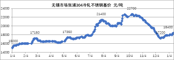 2021年304不锈钢冷轧产品(张浦)从年初15000元/吨,一路高频上扬,年内价格顶点出现在10月,涨至22700元/吨,环比年初价格上涨7700元/吨;随后出现高位跳水,12月下旬价格一度跌至17200元/吨,环比10月高点下跌5500元/吨。