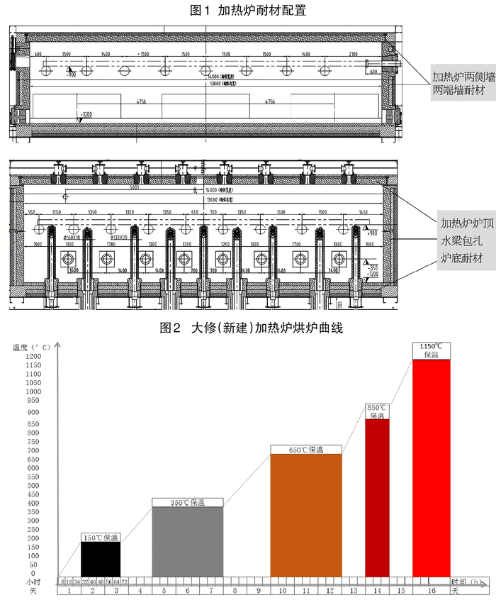 某钢厂轧钢加热炉耐材检修的内容为大修,主要检修内容为加热炉四周侧墙、均热段部分炉顶耐材更换、水管耐材包扎,为了将耐材中的游离水和结晶水排除干净,保证耐材正常使用,必须对加热炉在适当的时间和温度下进行烘烤。