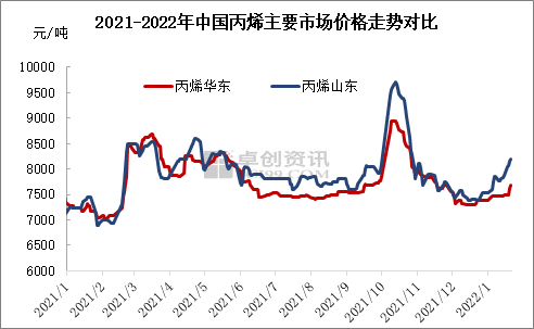1月份北方市场成本及供需支撑表现均偏强,丙烯市场价格重心强势上涨。截至1月20日,山东丙烯市场主流参照8180-8200元/吨,较上月底上涨665元/吨,涨幅8.84%。