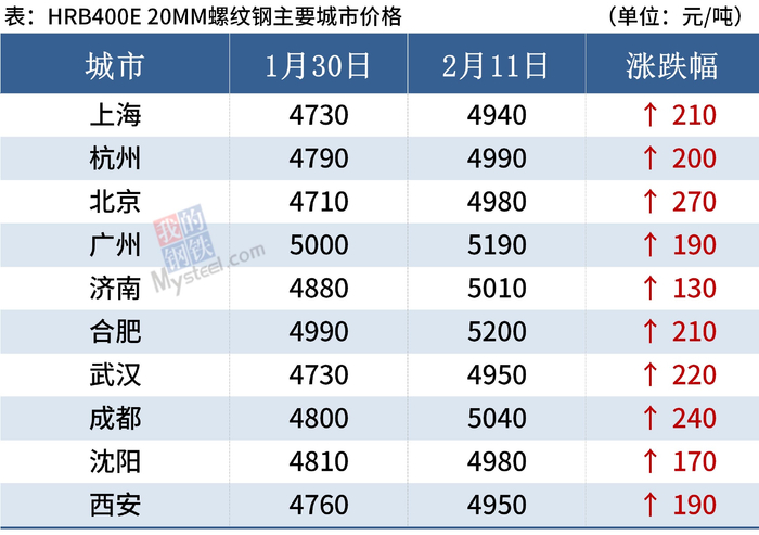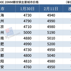 据Mysteel监测,截至2月11日,全国主要城市20mm三级抗震螺纹钢均价5032元/吨,较节前(1月30日)上涨215元/吨;8.0mmHPB300高线均价5244元/吨,较节前上涨221元/吨。
