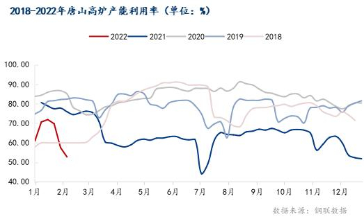 高炉生产情况:唐山地区126座高炉中有83座检修(不含长期停产),检修高炉容积合计75462m³;周影响产量约145.51万吨,周度产能利用率为52.75%,周环(较2月2日)比下降4.71%,月环比下降17.87%,年同比下降21.67%。