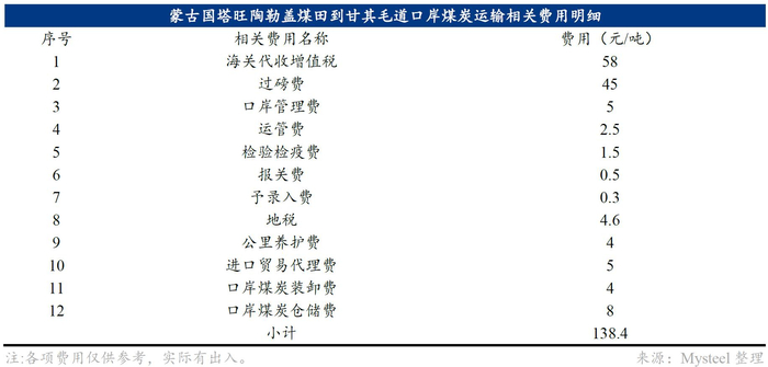 (2)嘎顺苏海图海关到甘其毛道口岸海关约30公里,煤炭每吨运费约300元,口岸费用约135元,见下表。(2021年后,由于疫情影响缺少司机,短盘运费已远超300元/吨,2021年高点近2000元/吨)