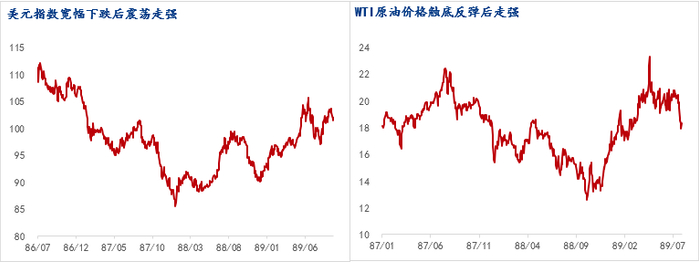 在此轮加息周期中,CRB现货价格指数以及美元指数上涨幅度较大。1984年8月-1983年3月,CRB指数上涨11.6%,美元指数上涨16.6%,而原油与黄金的价格保持区间震荡,未受到加息带来的影响。同时美国失业率得到有效控制,从1983年的10%高位回落至1984年7%附近。综合来看,此轮加息各个商品价格均迎来上涨,并且未引发资本市场大的动荡,同时将美国通胀率控制在4%左右,因此美联储通过加息,对通胀进行了有效控制,获得了美国国民的支持。