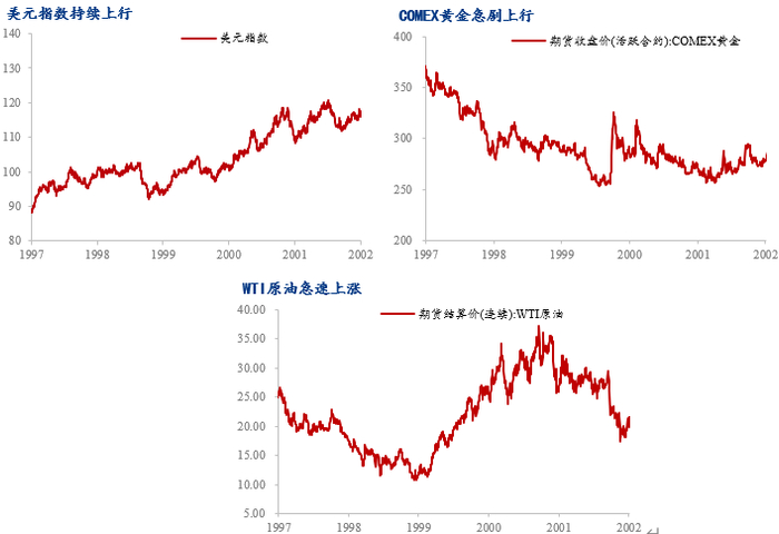 在此次加息周期中,美元、黄金和原油同时上涨,期间涨幅分别达到8.25%、4.78%和54.12%。其中黄金走势较为特殊,1999年金价处于历史低谷,9月26日欧洲15国央行协议限制黄金抛售量后金价飙涨,随后金价随着美元指数走强而震荡回落,整体上加息期间小幅上涨。