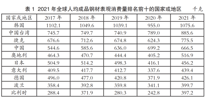 2021年全球人均成品钢材表观消费量为232.8千克,同比增加3.8千克,略超疫情前2019年的230.4千克,其中比利时、捷克、韩国、奥地利、意大利人均钢材表观消费量增长均超过100千克。韩国人均成品钢材表观消费量排名全球第一,为1075.6千克,其次是中国台湾的885.6千克,捷克位居第三,为775.5千克。中国在2021年以666.5千克的人均成品钢材表观消费量排名第四,较2020年降低32.7千克,详见表1。委内瑞拉、印度和南非仍排名后三位,人均成品钢材表观消费量仅分别为2.5千克、76千克和83.8千克,除了委内瑞拉人均成品钢材表观消费量较2020年小幅下降外,印度和南非的该指标分别比2020年提高11.3千克和20.5千克。