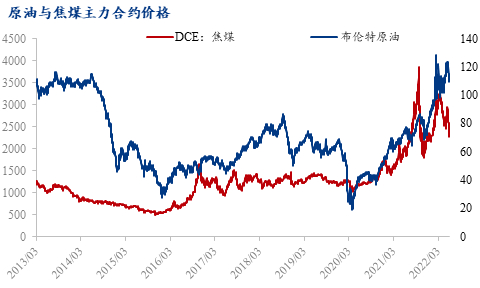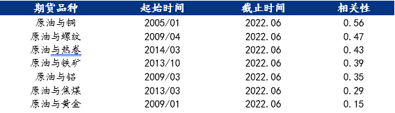 在比较原油与钢材及原料的价格关系时,不难发现,自2020年以来,通胀赫然写在了纸上,以原油为代表的大宗商品迎来了新一轮“牛市”,价格都创了历史新高。经过数据测算,原油与螺纹及热卷的相关性都在0.4以上,与焦煤的相关性为0.29,但这并不意味着原油价格上涨将伴随相关品种同时上涨,原因在于除去通胀因素,原油与黑色系大宗商品还受基本面的影响。与原油的表现不同,2021下半年后,在国家保供稳价和限产的背景下,钢材及原料价格迅速回落。近期也由于国内钢材消费恢复偏慢,成材及原料价格表现较弱。在有色金属中,铜与原油的相关性达到0.56,而铝为0.35,原因在于铜与原油更加类似,在国际市场上同时具备金融属性与商品属性。贵金属黄金作为避险资产,与原油的联系不强,相关性仅为0.15。