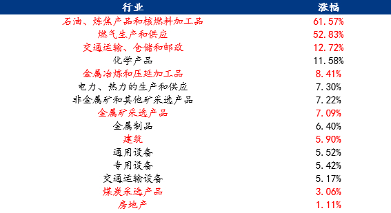 从模型测算结果来看,原油上涨100%将直接影响下游石油加工业,影响大小为61.57%,同时对原油有部分替代作用的燃气也受影响较大,涨幅达52.83%。由此可以看出虽然原油被称为“大宗商品之母”,但更多的是针对能源化工领域。对于黑色大宗商品而言,其对油价的上涨反而没那么敏感,根据模型测算,油价上涨对金属冶炼及金属矿采的影响程度分别为8.41%和7.09%,对煤炭开采的影响程度更小,结果仅为3.06%。对于市场关注的下游行业如建筑业及房地产等,原油价格上涨对其影响亦不明显,结果仅为5.9%和1.11%。从现实角度讲,原油与这些行业的联系并不密切,所以模型结果具有一定的解释性。至于钢价或煤价上涨对于下游行业的影响大小,笔者将会在下篇文章进行简单阐述。