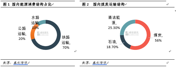 铁路运输具有运能大、运距长、速度快、运价低,且受天气因素影响小的特点,因此成为我国“北煤南运”、“西煤东调”的主要方式,尤其在2018年“公转铁”政策背景影响下,煤炭铁路发运量持续增加。目前,煤炭铁路运输量在煤炭发运量总和中占比在70%,占铁路货运总量的40%以上。