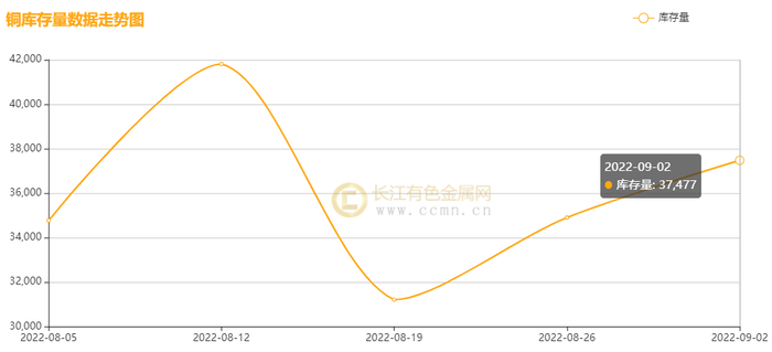 如上图所示,本周沪铜库存延续小幅回升,累积增加2579吨至37477吨,同比上周增幅6.88%。