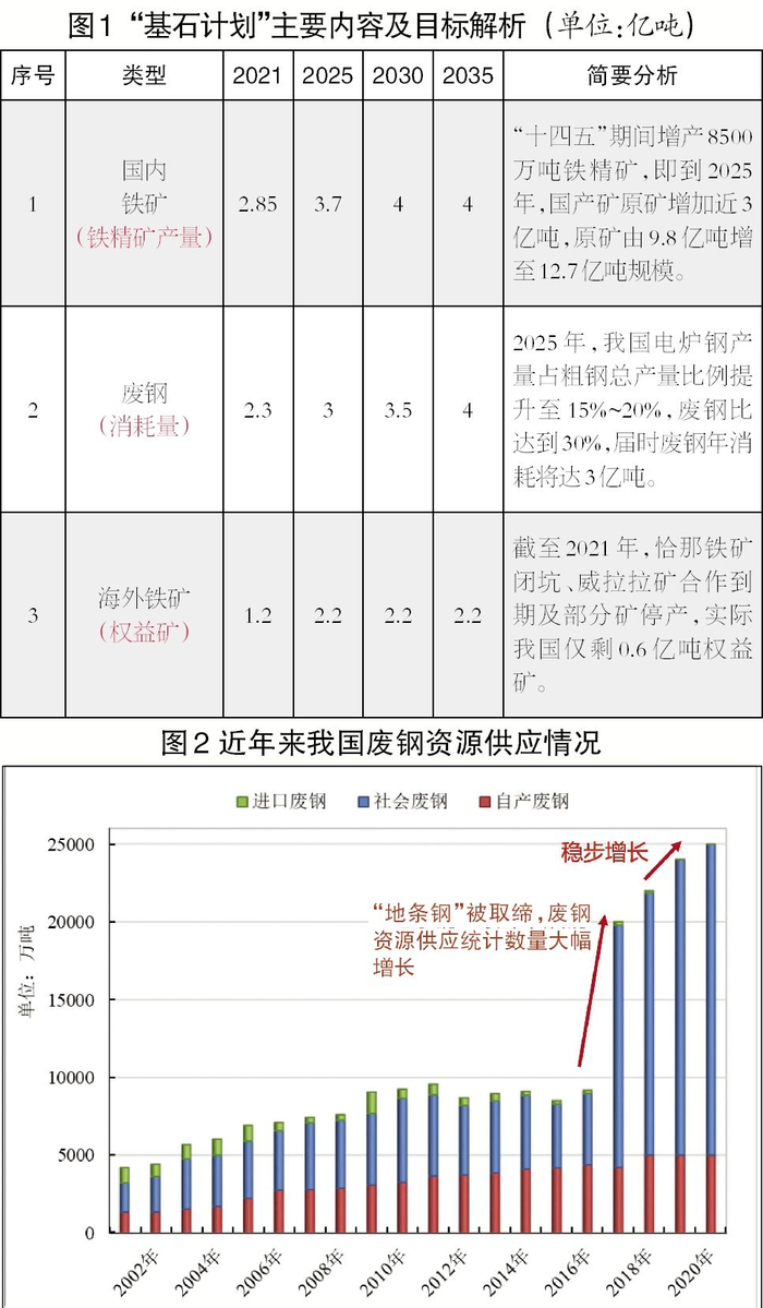 截至目前,“基石计划”推进已半年有余。笔者在对“基石计划”进展情况进行简要分析后认为,“十四五”期间,在“基石计划”目标实现中,国内铁矿石产量应有一定增幅,远期目标可以实现,但短期内较难有大幅增产;废钢积蓄进度加快,近、远期目标应该都可以实现;海外权益矿比例应有一定增加,远期目标可以实现,但短期目标实现难度较大。