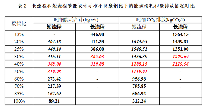 二、长流程和短流程在不同废钢单耗下的能耗和碳排放对比
