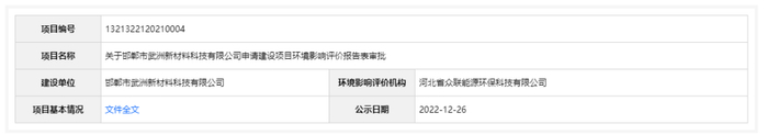 2022年12月26日,根据建设项目环境影响评价审批程序的有关规定,经审议,河北省生态环境厅拟对邯郸市武洲新材料科技有限公司一期冷轧项目环境影响评价文件作出准予批准意见。