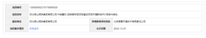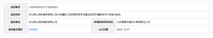 2022年12月1日,根据建设项目环境影响评价审批程序的有关规定,经审议,河北省生态环境厅拟对河北燕山钢铁集团有限公司1#、2#链篦机-回转窑球团两个项目建设项目环境影响评价文件作出准予批准意见。