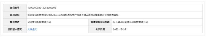 2022年12月26日,根据建设项目环境影响评价审批程序的有关规定,经审议,河北省生态环境厅拟对河北普阳钢铁有限公司1780mm热连轧卷板生产线项目环境影响评价文件作出准予批准意见。