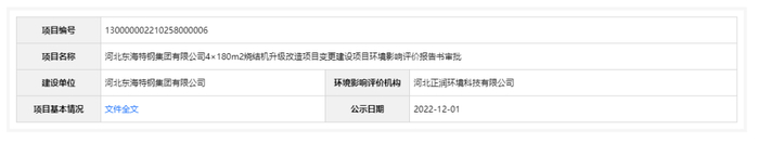 2022年12月1日,根据建设项目环境影响评价审批程序的有关规定,经审议,河北省生态环境厅拟对河北东海特钢集团有限公司4×180㎡烧结机升级改造项目变更建设项目环境影响评价文件作出准予批准意见。